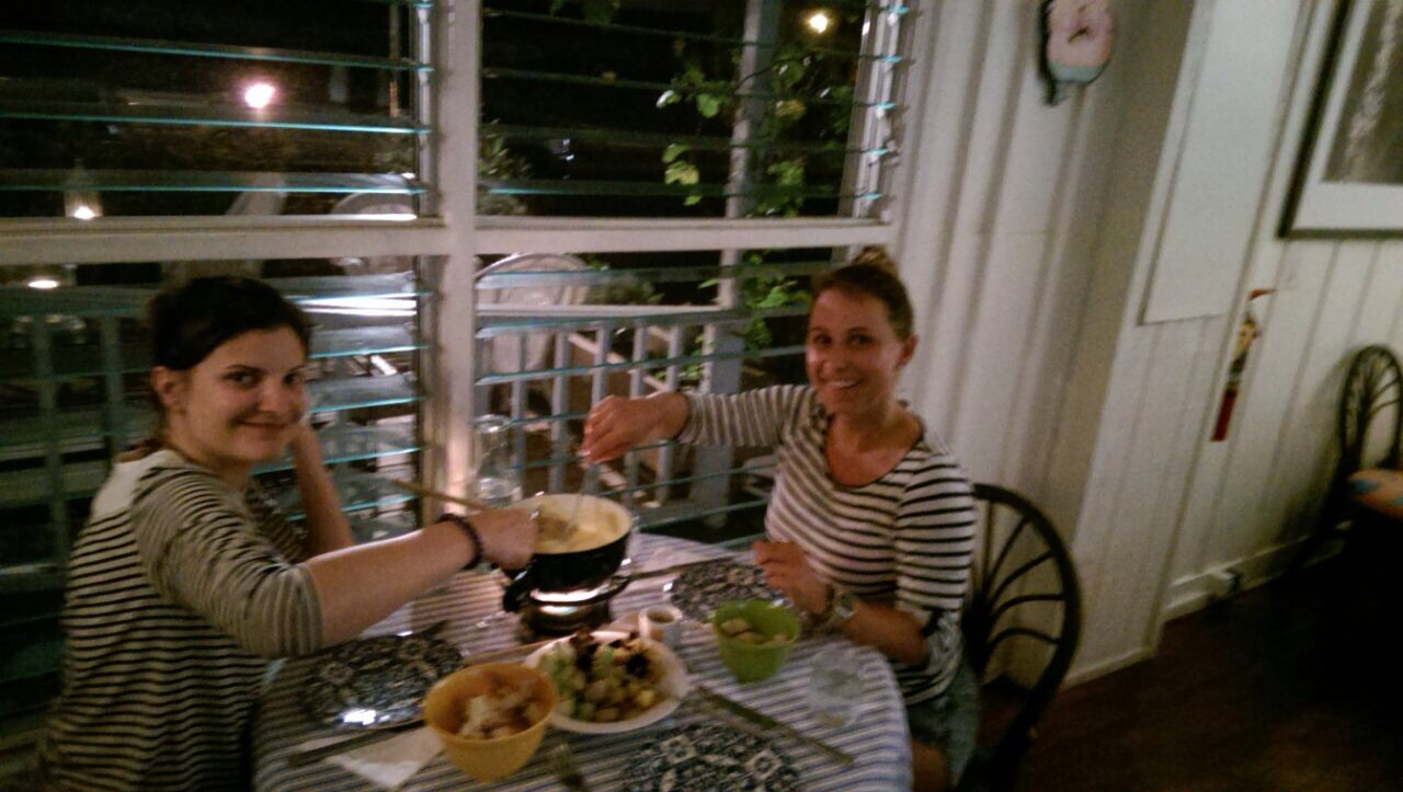 Nun gut, zum Essen gab es ein sehr feines echtes Schweizer Fondue. Der Käse wird direkt von Daheim importiert und das regnerische Wetter zauberte die perfekte Fonduestimmung. Zum krönenden Abschluss, baute Eddie noch ein Kunstwerk mit Besteck und Tischdeko, wunderschön…