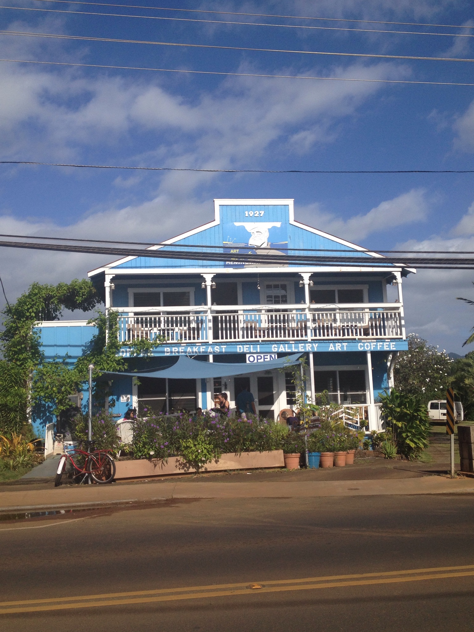 Zum Essen ging es ins Dorf. Kapaa hat und sehr gut gefallen. Alles kleine bunte Häuschen mit herzigen Läden, Restaurants und Cafés. Knapp am Hörsturz vorbei gerasselt (die laute Musik in seinem Auto hat uns Herzflattern beschert, Gott sei Dank kennt uns hier niemand), ging es ins Café Hemmingway.