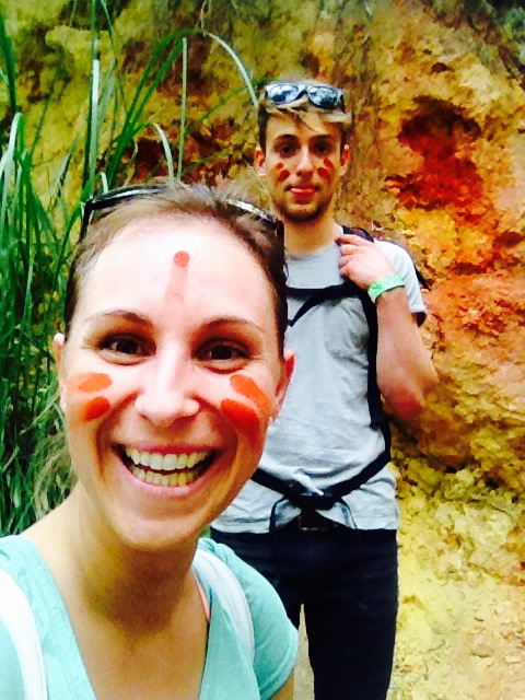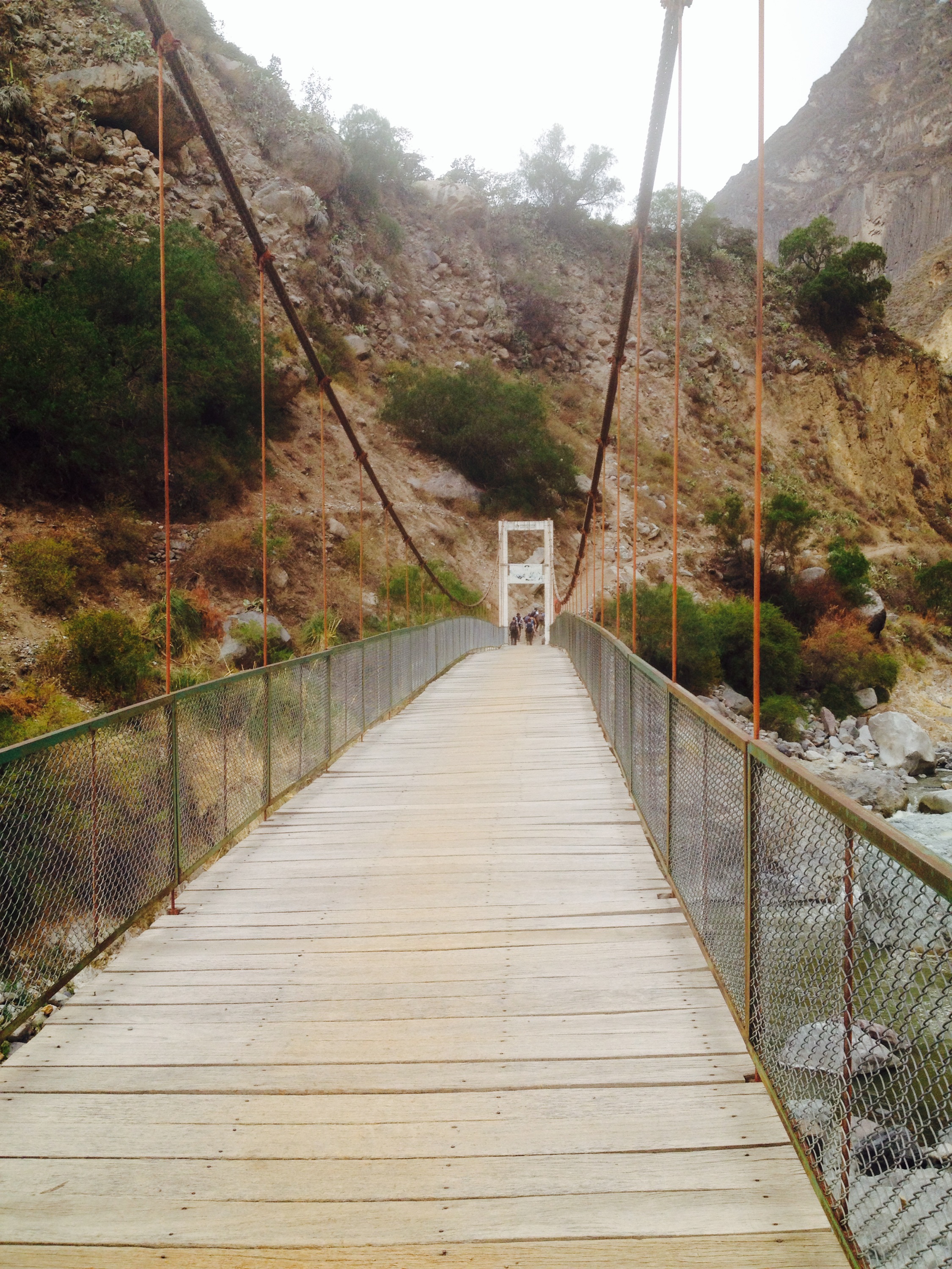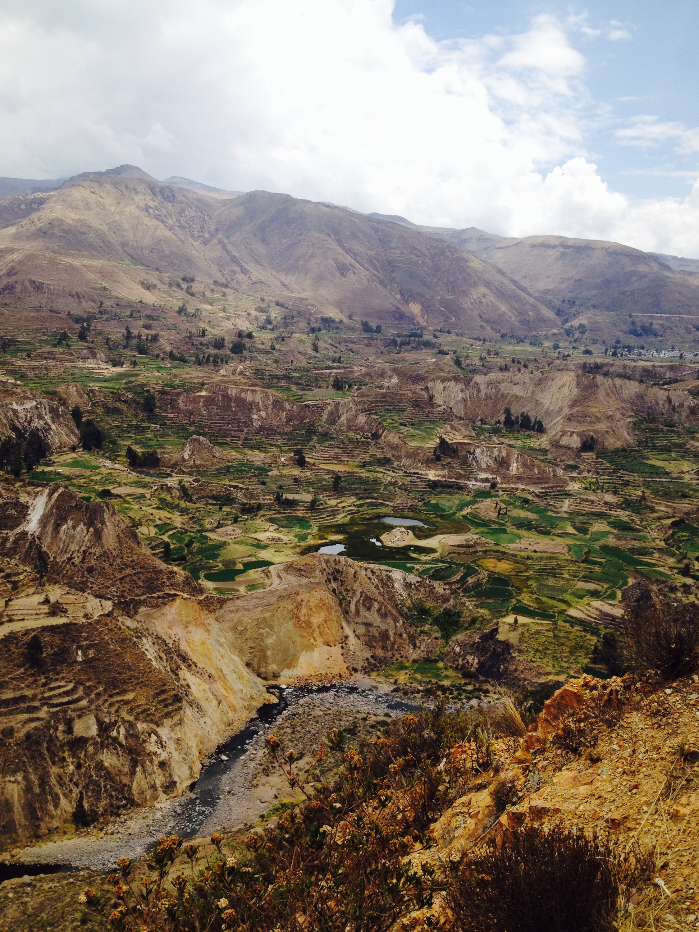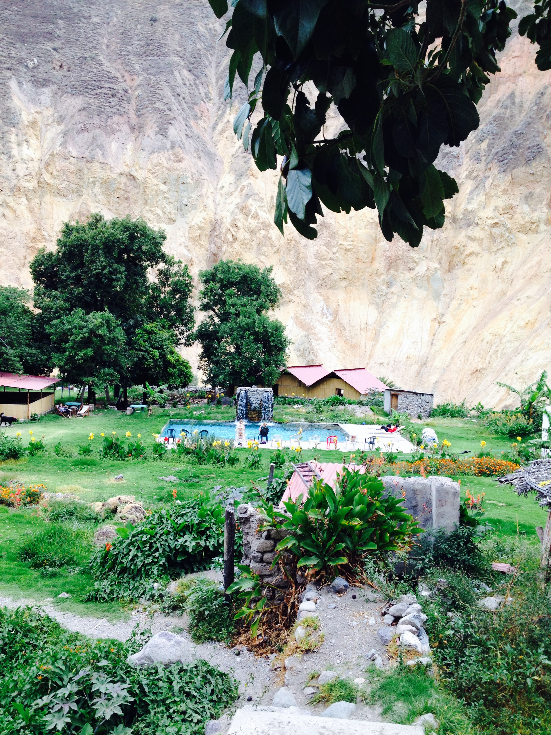 Die 1. Etappe des Tages führte uns rund drei Stunden den kompletten Hang hinunter in die Schlucht, um auf der anderen Seite alles wieder hoch zu laufen. Gestartet sind wir auf 3200 Meter. Das wohlverdiente Mittagessen haben wir hundemüde in einem kleinen Weiler eingenommen. Von da ging es dann weitere 3 Stunden hoch und runter bis wir endlich in „Sangalle el Oasis“, unserem Nachtlager, eingetrudelt sind. Mit etwas natürlicher Kriegsbemalung, war der Endspurt dann auch nur halb so streng:-) Zur Enspannung gab es ein erfrischendes Bad im Pool und ein kurzes Nickerchen inkl. Daunenjacke und Kappe bevor es Zwiebeln mit Spaghetti gab – kleines Déjà-Vue aus Big Island/Hawai’i:)