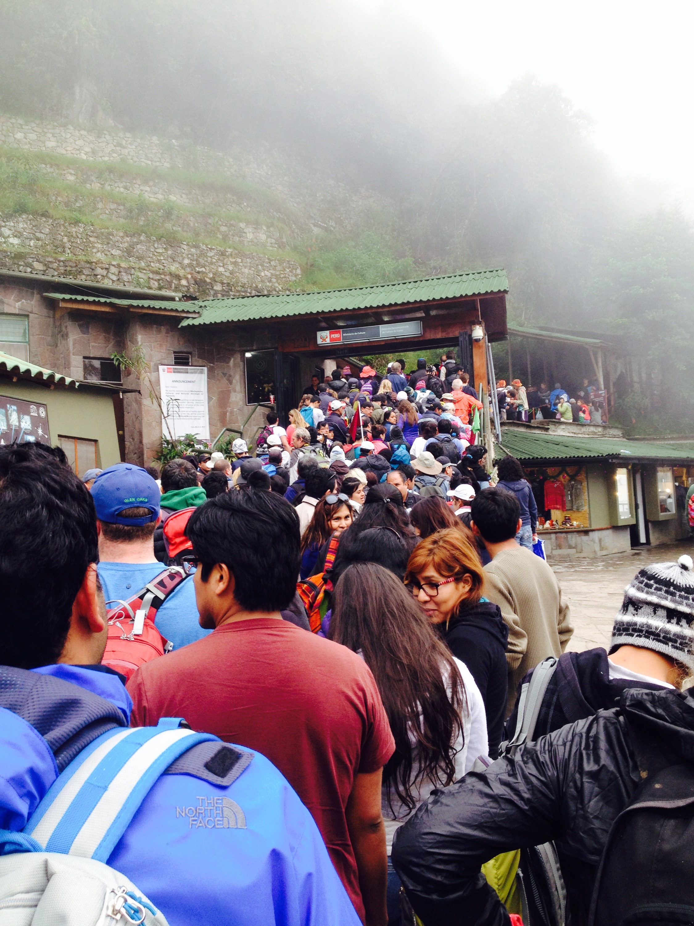 Leider hat es die ganze Nacht geregnet und der Morgen sah nicht freundlicher aus. Trotzdem haben wir uns nach dem Frühstück zu Fuss auf den knapp 2-stündigen Weg hoch zum Machu Picchu gemacht. Tickets müssen bereits vor dem Besuch gekauft werden. Der einfache Eintritt kostet um die CHF 40.- und es können weitere Berg-Zugänge dazu gekauft werden. Im Verlgleich zum Colca Canyon brachte mich dieser Aufstieg mehr zum Schwitzen. Am Ziel knapp am Sauerstoffzelt vorbeigerasselt, war erst einmal anstehen angesagt. Im 5-Minuten-Takt treffen Busse mit immer mehr Besuchern ein. Bei 2500 Besuchern pro Tag in der Hochsaison, ist hier nicht schlecht was los.