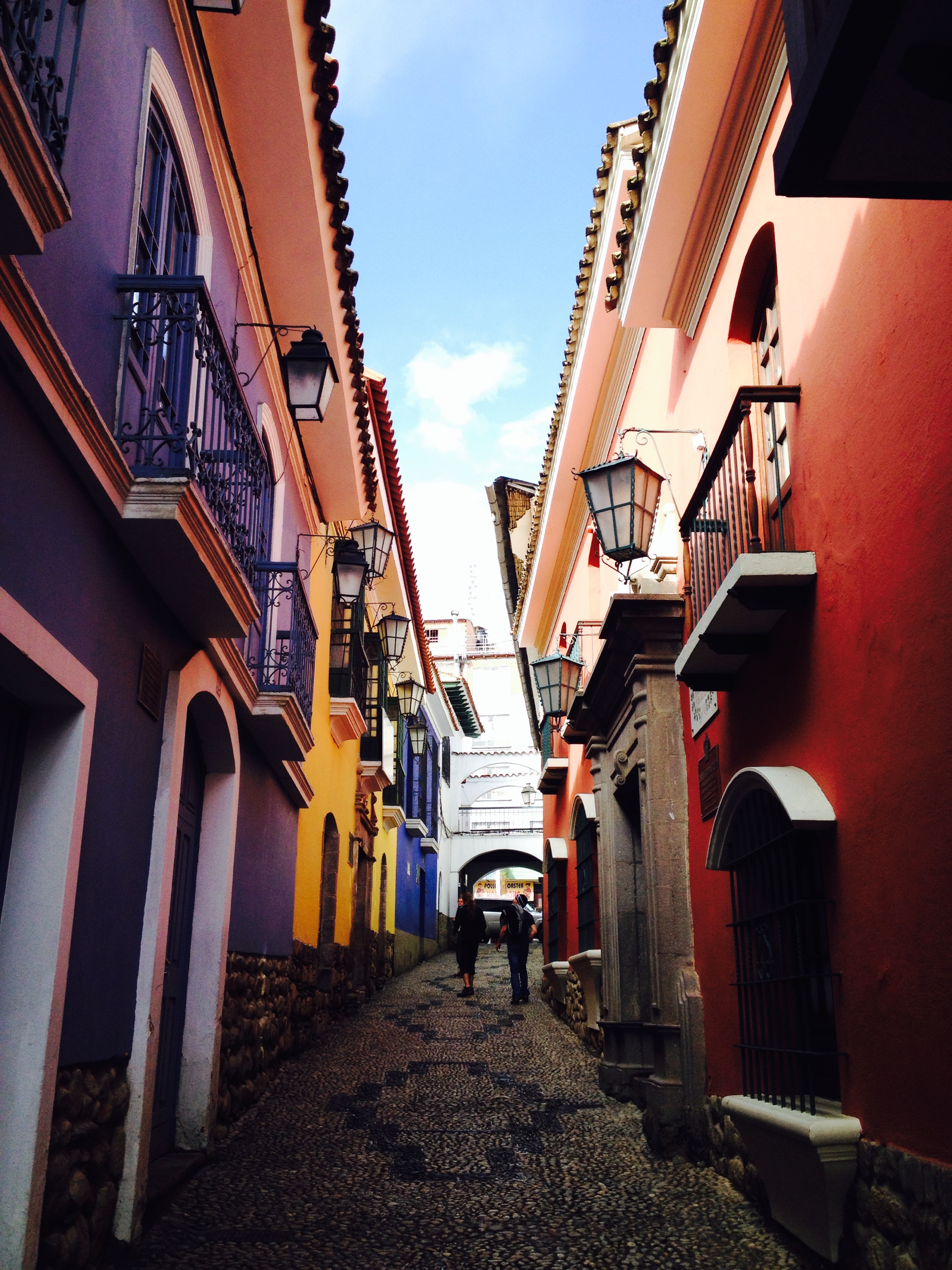 Immer noch vom schlechten Gewissen geplagt, begleiteten uns die Jungs auf Stadt-Erkundung. Sightseeing-Busse kennt wohl jeder – wir haben uns allerdings für die Seilbahnvariante entschieden. Für umgerechnet 30Rp. pro Stecke ging es einmal ganz nach oben und einmal ganz nach unten. So bekamen wie einen super Überblick über die Stadt. Wir sahen Kinder spielen, Hunde herumtollen und zwischendurch schöne Villen mit Pools. Den ersten Kaffee gab es dann im Reichenviertel San Miguel. Von dort ging es mit dem Bähnli wieder zurück in unseren Distrikt und zu Fuss in die Calle Jaen. Die kleine Gasse mit den bunten Häusern und dem herzigen Etno Kunst Café sollte man unbedingt besuchen.