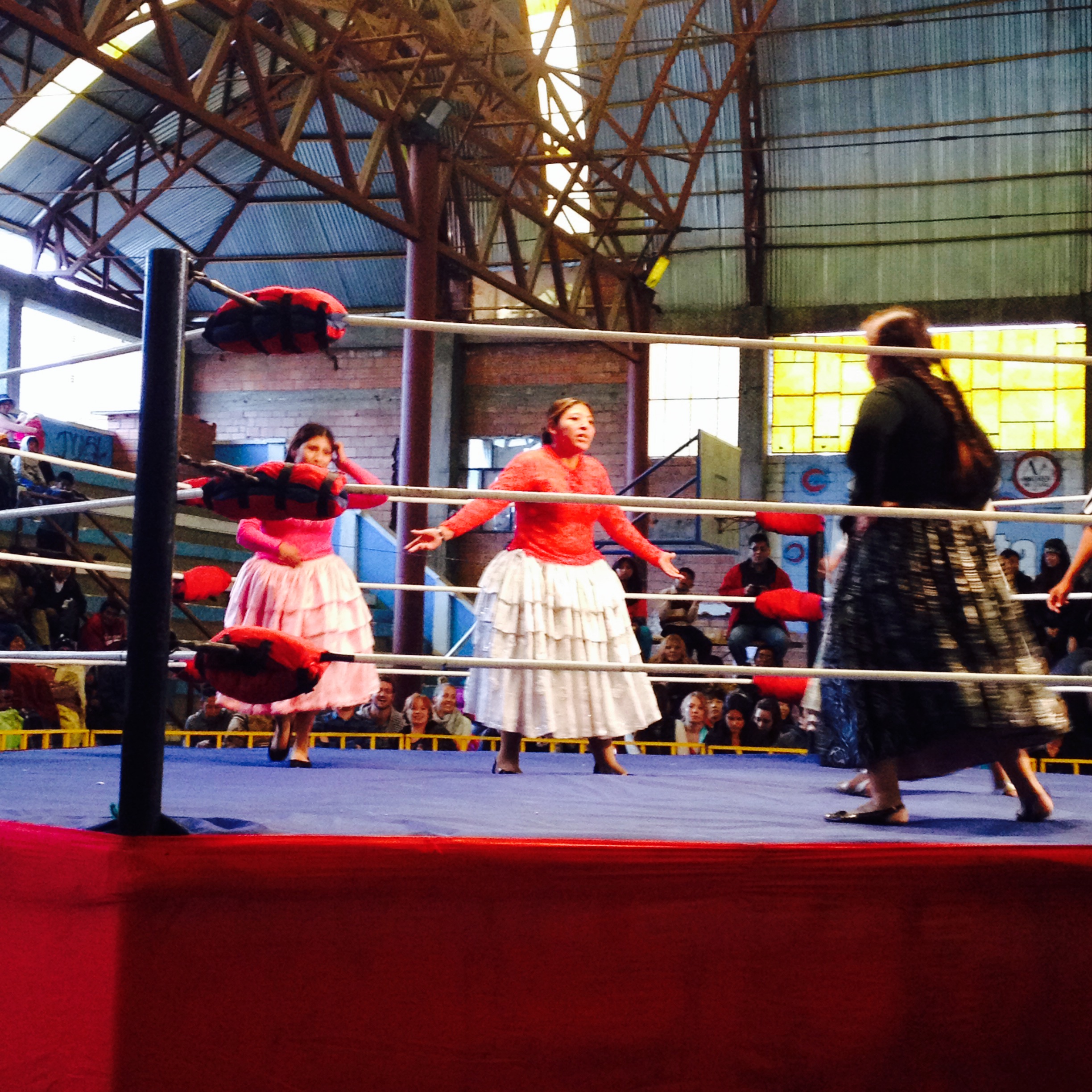 In La Paz und sonntags noch nichts vor? Dann empfiehlt sich der Besuch der „Wrestling Cholitas“ Show – bolivianische Frauen in traditionellem Rock, die sich mal mehr oder weniger gut geschauspielert an den Zöpfen zu Boden reissen oder hauen. Für uns Gringos ein lustiges Event mit Popcorn und Hot Dogs, für die Einheimischen wohl DER Sonntagsplausch. Zahlen wir Touristen 4x so viel wie die Einheimischen, geniessen wir einen zweifelhaften VIP Status und müssen uns nicht in die ellenlange Schlange vor dem Eingang stellen und nicht auf der kalten Beton Tribüne sitzen. Bevor es los ging, gab es noch ein paar Runden Männer-Wrestling. Wir, eher mit Fragezeichen auf der Stirn wo wir hier bloss gelandet sind und die Bolivianos ab der ersten Minute voll am Mitfiebern. Kinder so wie Erwachsene spritzten mit Getränken und warfen Popcorn oder Abfall in Richtung der Kampf-Protagonisten. Lustig für ein Stündchen aber irgendwann hatten wir es gesehen und kehrten zurück ins warme Hostel. Für mich gab es übrigens noch eine Handkuss eines Wrestlers in weisser Legging – Jackpot!;)