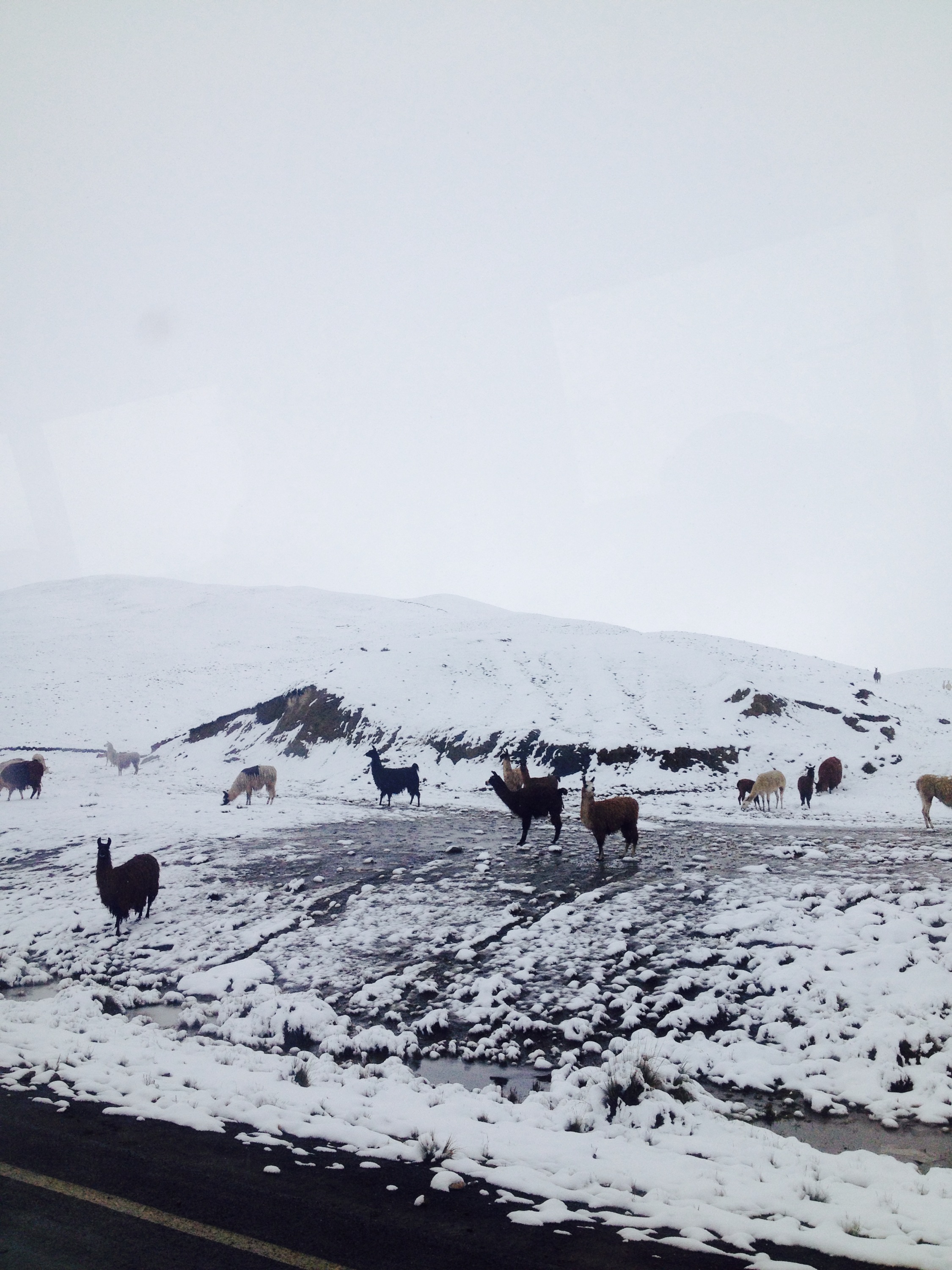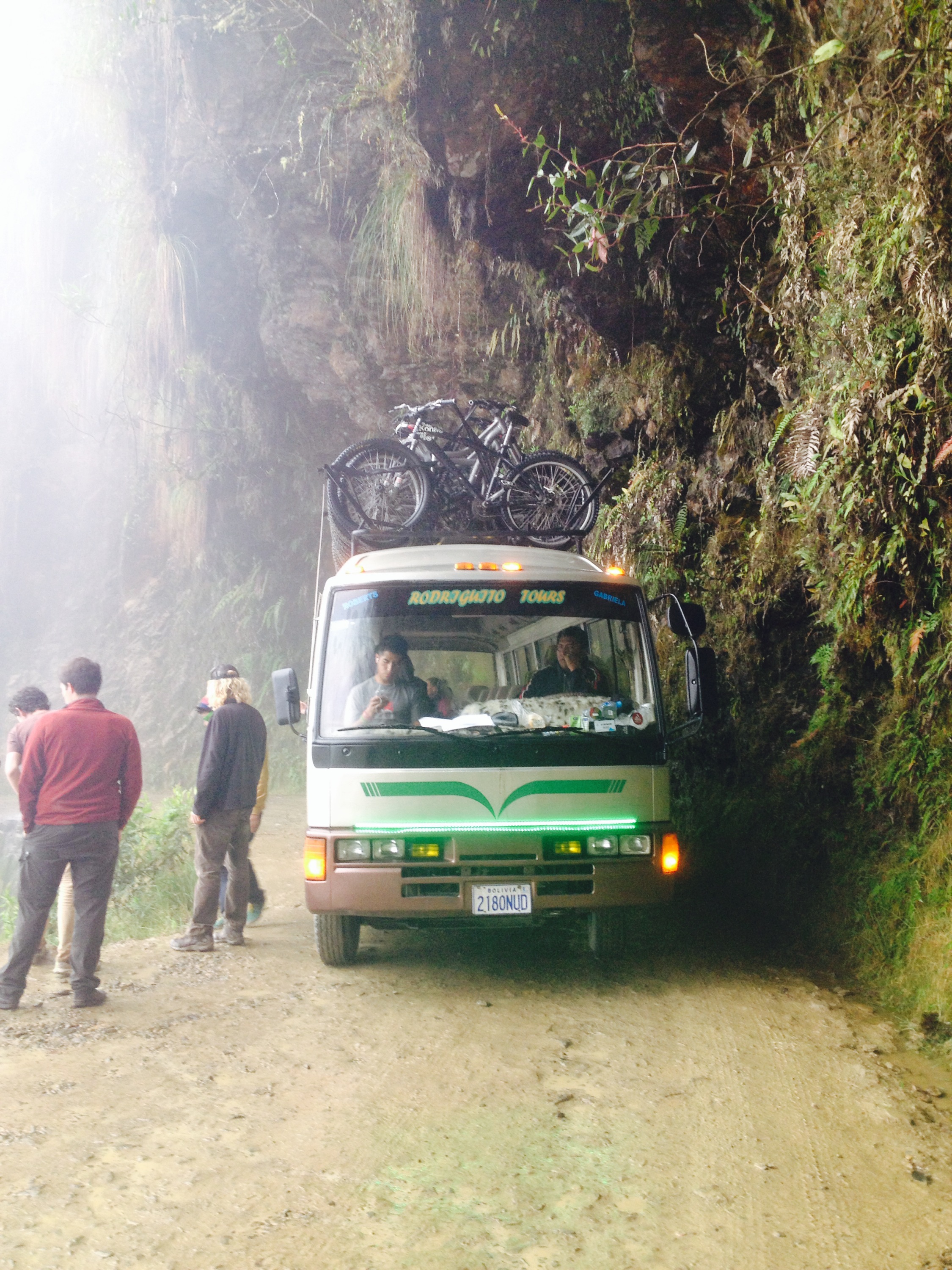 Bei Nebel und leichtem Regen ging es los. Beim Busterminal musste sich jeder Bus mit einer Passagierliste für die „Death Road“ registrieren und den Zufahrtsstempel holen. Dort erfuhren wir, dass die Hauptstrasse wegen diversen Erdrutschen gesperrt ist. Unsere Guides entschieden eine halbe Stunde abzuwarten und dann zu entscheiden. Aus Sicherheitsgründen konnten wir schlussendlich nicht die gesamte Strecke befahren. Auf 4700m wurde jedes Bike vor dem Start eingestellt und geprüft. Nicht überraschend, gab es erneut ein Ritual um „Pacha Mama“ (Mutter Erde) zu danken und um Schutz zu beten. Einen Spritzer auf die Erde, einen auf das Bike und einen in den Mund; Weihwasser dachte ich. Der pure Alkohol hat mich schön überrascht und zugleich aufgewärmt:) Ausgerüstet mit wind- und wasserfester Kleidung ging unser Abenteuer dann los. Die Strecke ist nicht wirklich anspruchsvoll, gefährlich ist sie nur, weil es an der Kante steil in den Abgrund geht. Eine Unaufmerksamkeit, ein zu apruptes Bremsen oder zu schnelles Fahren, können tödlich enden. Nach wie vor gibt es tragische Unfälle bei denen Menschen ihr Leben lassen. Im Internet findet man ausreichend Informationen dazu… Jede Kurve hat dementsprechend ihren eigenen respekteinflössenden Namen; Schlüsselbeinbrecherkurve war wohl noch am harmlosesten. Eine Japanerin bezahlte erst noch mit ihrem Leben, weil sie sich selbst fotografieren wollte – bei voller Fahrt…