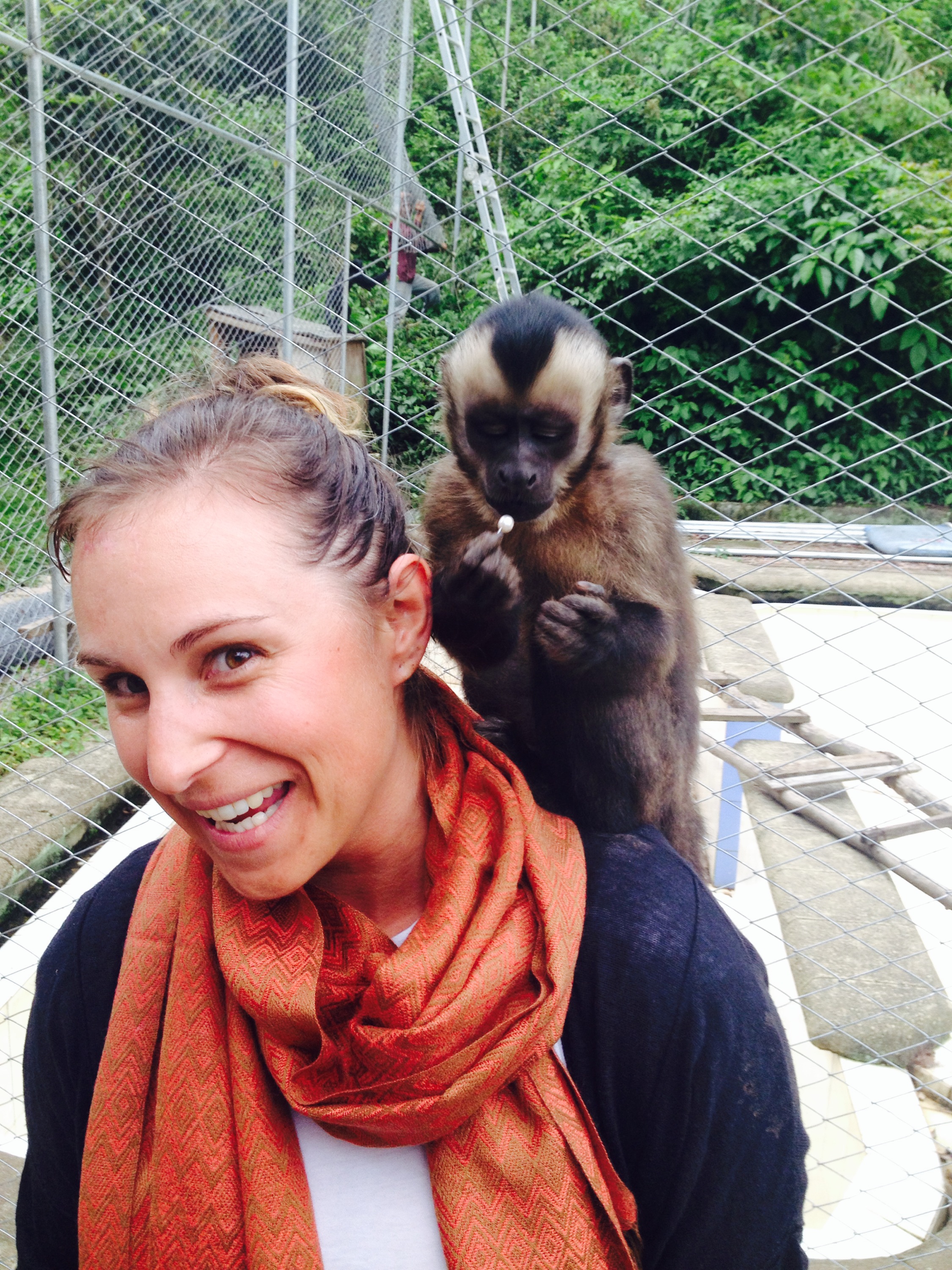 Erleichtert am Ziel angekommen gab es erst einmal ein kaltes Bier für alle. Zum Essen ging es dann weiter in eine Tier-Rettungsstation. Vorallem Affen werden hier aufgenommen. Das Zentrum lebt von Spenden und wird von SOS Animal unterstützt. Da ich für die erhaltene Reise-Selfie-Checkliste noch einen Äffchen-Schnappschuss brauchte, kam mir der Besuch gelegen (Gabriel, jez fehlt mär nur no där Pilot!). Ein Kapuziener-Äffchen hatte sich in meine Ohrstecker verliebt und diese ohne zu zögern sehr sanft und elegant entfernt. Aus Angst in Südamerika ausgeraubt zu werden, hatte ich vorsichtshalber die echten Perlen durch 2$ Stecker ersetzt. Mein Glück, das Äffchen hütete die Perlen nämlich wie einen Millionen Schatz und es gab kein zurück mehr:)