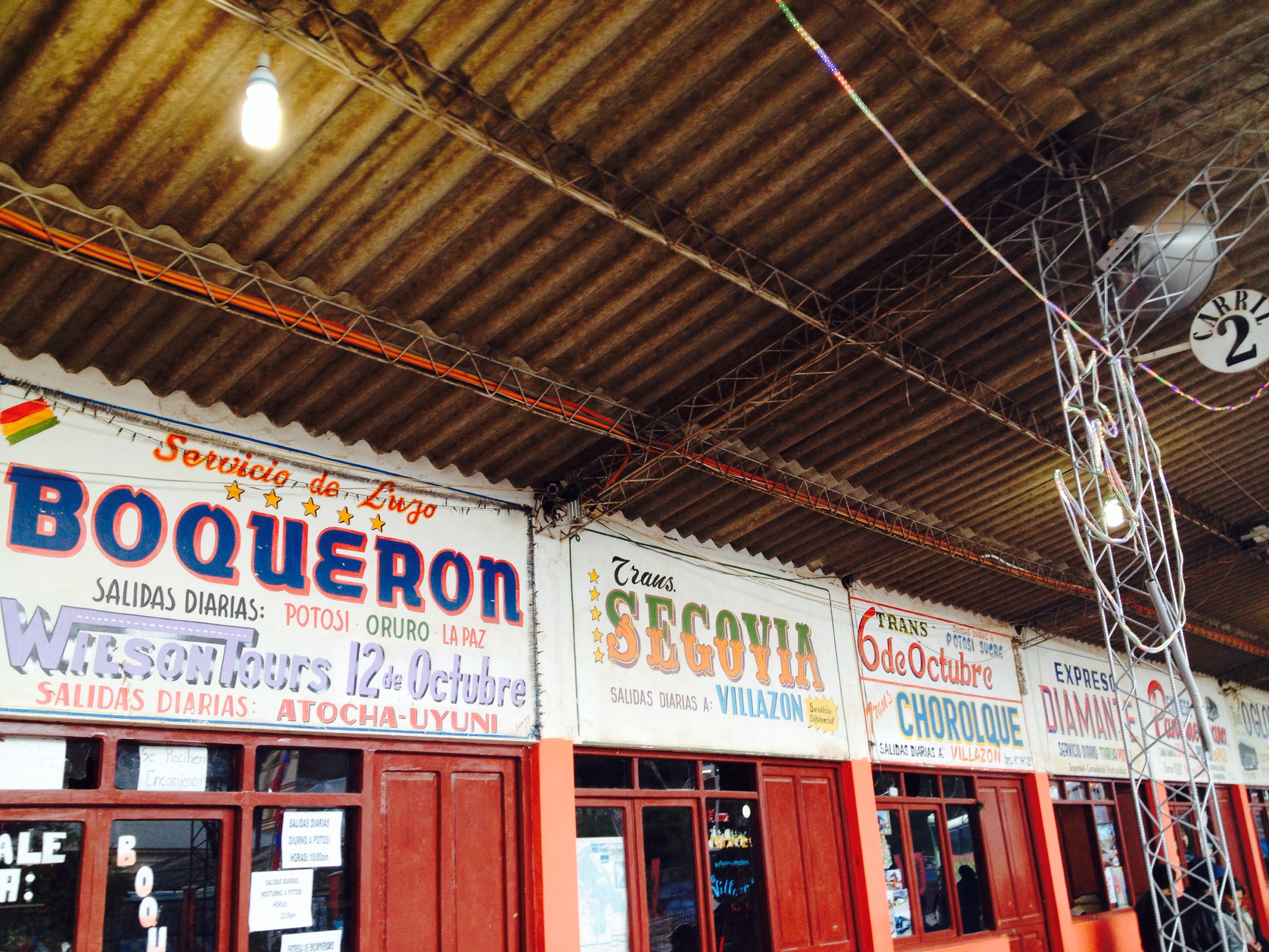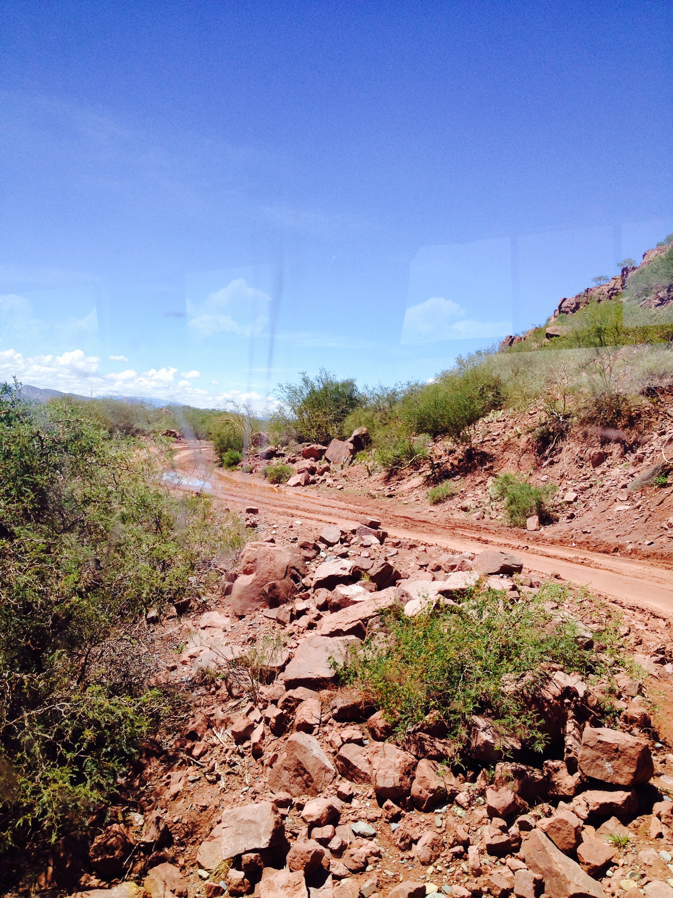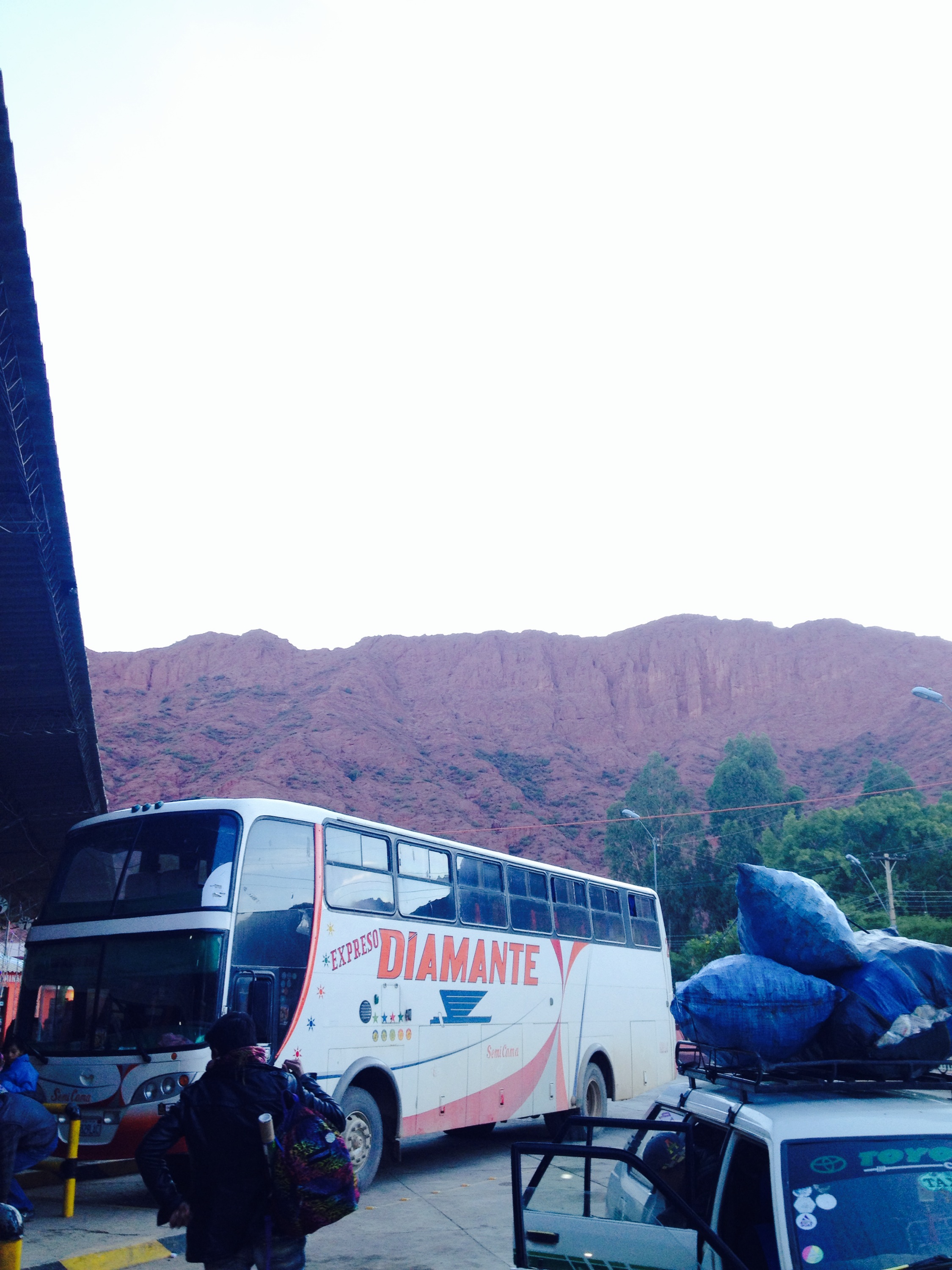 Die Nachtbusfahrt von Uyuni nach Tupiza war eher unspektakulär. Es gab keinen Grund Geld in Socken zu verstecken;) Stolz war das Busunternehmen allerdings auf die 5 Sterne am Bus und der Heizung. Von der haben wir leider nichts mitbekommen. Eingepackt in unzählige Schichten haben wir trotzdem gefroren. Der anhaltende Luftzug durchs undichte Fenster war auch nicht wirklich förderlich. Morgens gegen 5 Uhr sind wir dann in Tupiza angekommen. Ein herziges kleines Busterminal – tote Hose allerdings. Weit und breit kein 24h Restaurant oder Kiosk. Eingepackt im Schlafsack, harrten wir am Terminal aus, bis eines der Busunternehmen das Ticketbüro öffnet. Das erste bot gleich für 7 Uhr einen Bus an und hatte noch Tickets. Immer noch hungrig wollte ich einfach nicht wahrhaben, dass es nicht einmal die Möglichkeit gibt, wenigstens einen Schokoriegel zu kaufen. Kurz vor Abfahrt sah ich mich noch einmal um und siehe da, keine 50m entfernt, bin ich dann in einer Gasse verschwunden und prompt in einem Art Zelt-Restaurant gelandet. Die Zeit drängte und so gab es das selbe was die Einhemischen auf ihren Tellern hatten. Die frittierten Fladenbrote sollten als 3in1 Produkt verkauft werden: yummie, sättigend und sanfte Hände für mindestens zwei Tage 🙂 Gewappnet mit Proviant haben wir es uns sogleich im Bus gemütlich gemacht. Selbstverständlich wieder 5 Sterne;-) Die Regenzeit ist nicht spurlos am Bus vorbei gegangen und so lag überall getrockneter Schlamm. Immerhin waren die Sitze sehr bequem und die Fahrt verging im Nu. Wir waren übrigens wieder einmal die einzigen Touristen – und die einzigen die froren; hier reist man normalerweise nämlich mit Decke. 🙂