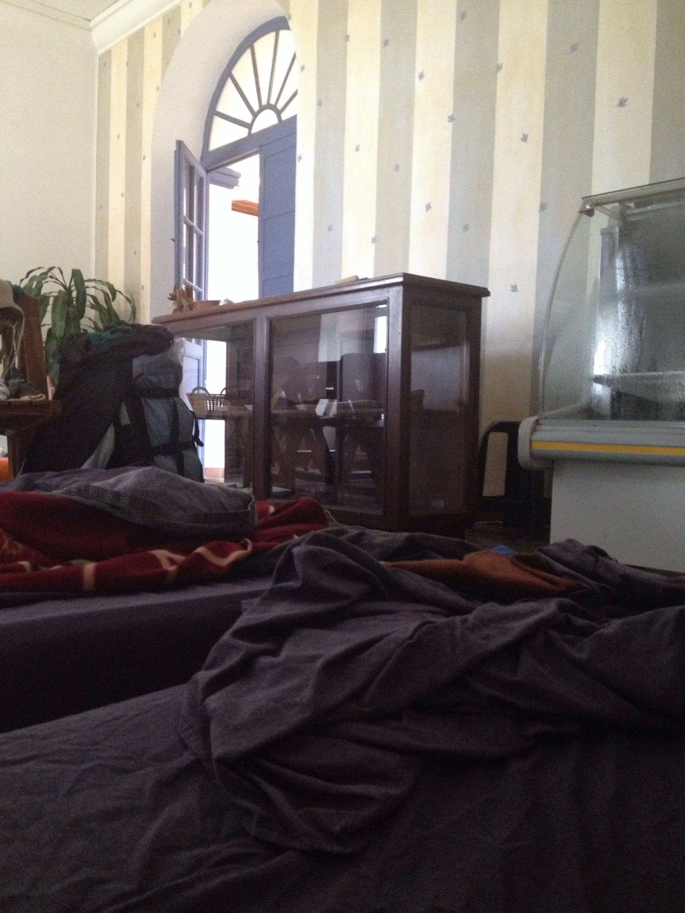 Bei Ankunft fühlten wir uns wie in einem anderen Land. Ferien in Spanien waren also angesagt! Beim ersten Eiskaffee haben wir ein Zimmer in einer der wenigen Unterkünften gebucht. Im Hostel haben wir dann erfahren, dass es gar keinen Platz gibt für uns. Es war ihm äussert unangenehm und so bot er uns kurzerhand einen Schlafplatz im hauseigenen Café an. Auf frisch eingebetteten Matratzen genossen wir süsse Träume neben Torten und Cremeschnitten und für mich war es eine Übernachtung mehr auf meiner Liste der aussergewöhnlichsten Schlafplätze:-)