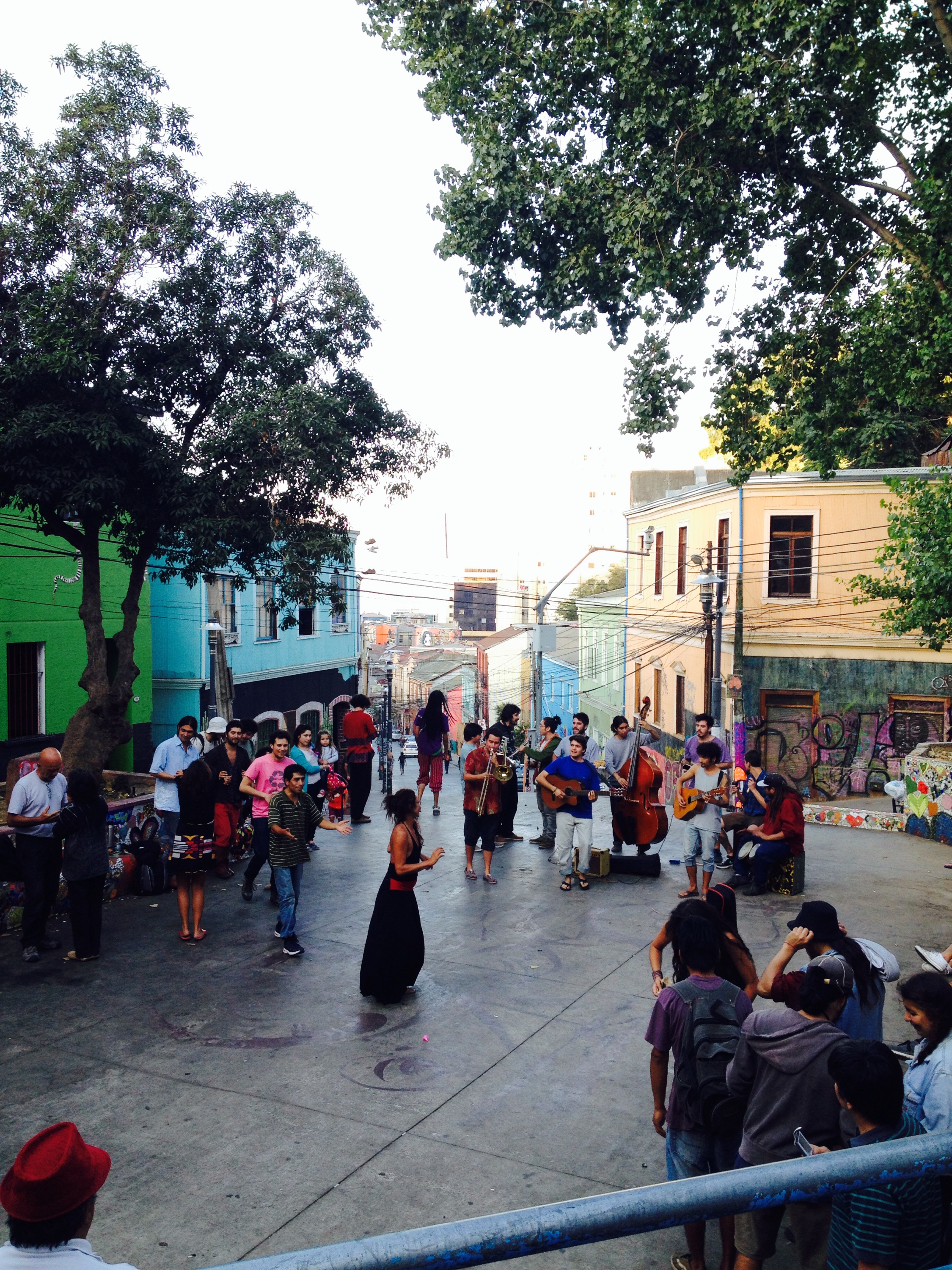 Die Abendsonne genossen wir im Park des alten Gefängnisses auf dem Cerro Alegre. In den Bann gezogen hat uns dort die spirituell angehauchte Truppe, die sich während zwei Stunden näher kam. Der Ausdruckstanz gemischt aus Hüpfen, Yoga, sich fallen lassen, zucken oder sich aufeinander wälzen, vermochte nicht alle Schaulustigen zu überzeugen – und wer mich kennt, weiss, dass ich ein grosser Fan von „gspirrsch mi fühlsch mi“ bin;) Wir liessen uns nicht mitreissen und blinzelten lieber in die Sonne. Auf dem Rückweg kamen wir noch an einem Plätzchen vorbei, auf dem sich Künstler präsentieren konnten. Ob Singen, Tanzen oder Geschichten erzählen – jeder aus dem Publikum darf sich melden, um sein Talent zum Besten zu geben.