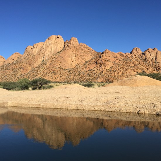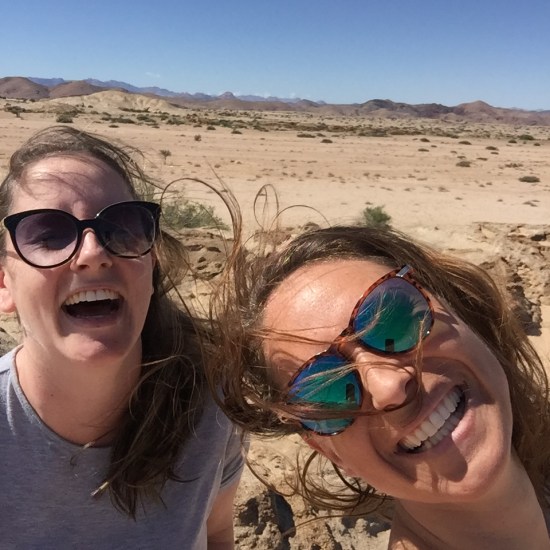 ELEPHANTS!! Let’s start from the beginning. Kate drove us safely to Twyfelfontein were we stayed for two nights. The area is famous for stone engravings & paintings. This time I had so much more space on my own in this camping ground and we even had our own open air kitchen area and bathroom giving us a little feeling of glamping. Unfortunately Kate & Sandra were not allowed to use the swimming pool (exclusively for guests of the resort…). Let’s try to sneak into the neighbor’s hotel then: success – this worked out for both days) If they didn’t, they wouldn’t have met a guy from the hotel who asked for help to pull someone out of the sand with the chance to see elephants. Sandra was skeptical and not willing to pay as he was asking us for help. Ready to leave he offered to join him for free. Here we go and look who welcomed us on the road: